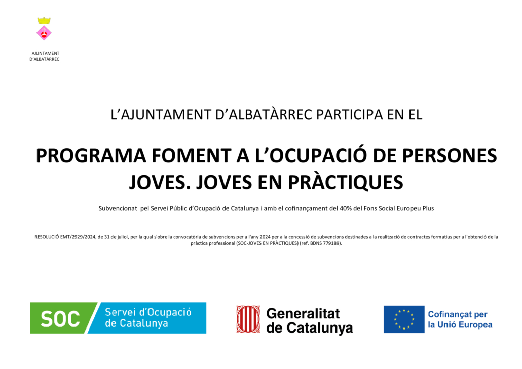 El programa és subvencionat pel Servei Públic d’Ocupació de Catalunya – SOC i Servei Públic amb el cofinançament del 40% del Fons Social Europeu Plus.